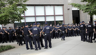 On duty: New York Police Department officers prepare to patrol the city for Hurricane Irene's arrival